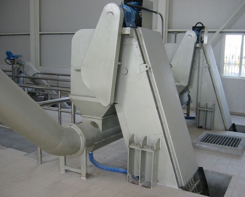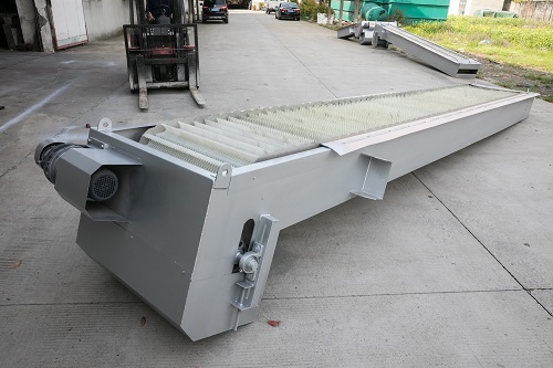 回转式机械格栅除污机ABS工程塑料、尼龙6、尼龙1010或不锈钢制成特殊形状的耙齿按一定次序装配在齿耙轴上,形成一条封闭的耙齿链。水下栅片(耙齿)截留污物沿轨上行,当达到项部时,因弯轨和齿轮的导向作用,使相邻耙齿间产生相对推移运动,将污物外推,依自重卸入污物盛器内。同时特制转刷将耙齿上微量残留污物剔除干净。