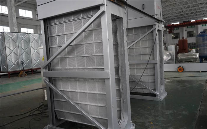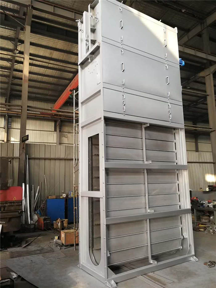 内进流式网板格栅除污机的机架为不锈钢板材与型钢组装、焊接成的一整体式长方体刚性结构。机架下部迎水端开有一个进水洞口,机架的前后壁板上设有导轨,其上部还设有一内部集渣槽,并延伸至机外。机架安装于格栅井的中央,机架的两侧与格栅井之间的间隙为格栅滤后出水的通道。在机架的迎水端两侧布置了导流挡板,其在导流的同时,可防止漂浮垃圾通过。