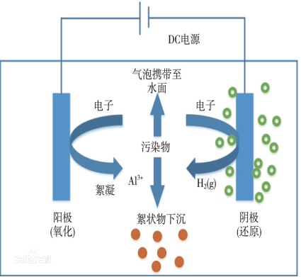 电絮凝气浮机的反应原理是以铝、铁等金属为阳极,在直流电的作用下,阳极被溶蚀,产生Al、Fe等离子,在经一系列水解、聚合及亚铁的氧化过程,发展成为各种羟基络合物、多核羟基络合物以至氢氧化物,使废水中的胶态杂质、悬浮杂质凝聚沉淀而分离,同时带电的污染物颗粒在电场中泳动,其部分电荷被电极中和而促使其脱稳聚沉。废水进行电解絮凝处理时,不仅对胶态杂质及悬浮杂质有凝聚沉淀作用,而且由于阳极的氧化作用和阴极的还原作用,能去除水中多种污染物。