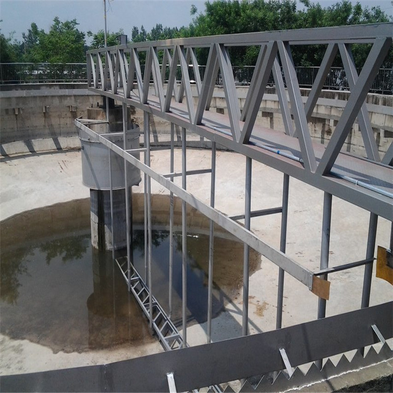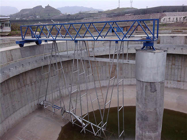 其主要由驱动机构、主梁、中心旋转支座、导流筒、刮泥系统、排渣斗、撇渣板、撇渣斗、出水三角堰板、浮渣挡板、控制箱等部件组成。