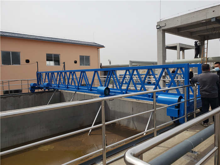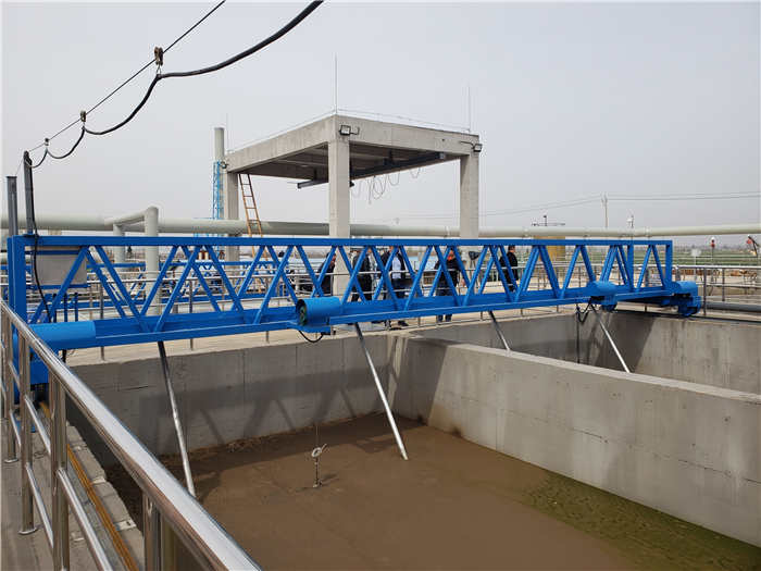 提耙式桁车刮泥机用于污水处理厂平流沉淀池,将沉降在池底的污泥刮集至集泥槽,集泥槽配置潜污泵,泵吸式将污泥排出沉淀池,并将池面的浮渣撇向集渣槽(可选)。