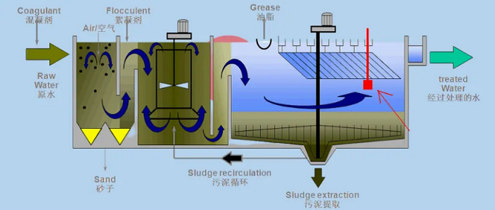 沉淀分离池底部的刮泥机进行连续刮扫,以促进沉淀污泥的浓缩,部分污泥通过污泥回流管回流到絮凝反应池中,用来保持絮凝反应池中所需的污泥浓度,促进絮凝过程中矾花的生长并且提高矾花的密度,剩余污泥外排进行进一步处理。