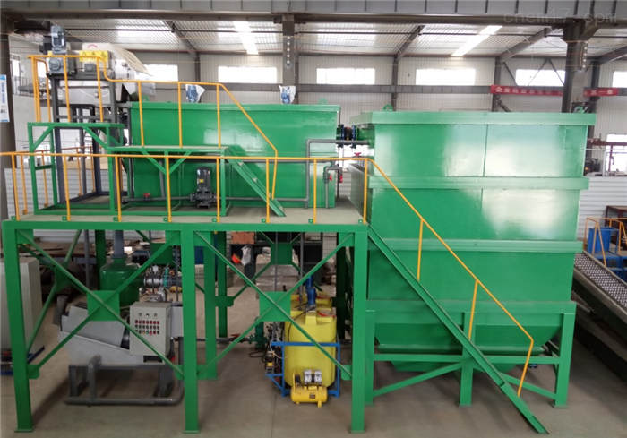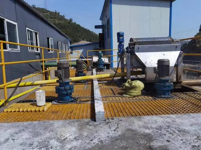 磁种回收系统由高速剪切机和磁粉回收机组成,含磁污泥被高速剪切机快速粉碎实现含磁污泥中的磁粉脱离,磁粉回收机采用稀土永磁高强度磁材,对磁粉的回收率可达 95% 以上,回收的磁粉可以循环使用,流失的磁粉折合每吨水的费用不到两分钱,同时磁粉是稳定清洁成分,不会对环境造成二次污染,回收磁粉后的污泥进入污泥脱水系统压滤脱水,泥饼可装车外运。