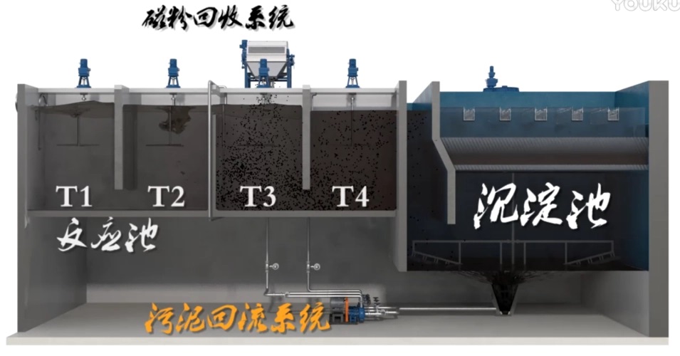 处理时间短,整个处理过程可以在10-15分钟完成,含磁污泥在澄清池底部聚集,经过排泥系统排入磁种回收系统。
