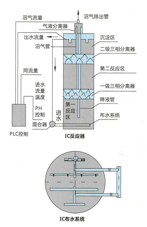 IC 反应器构造的特点是具有很大的高径比,一般可达 4-8,反应器的高度达到20m 左右。整个反应器由第一厌氧反应室和第二厌氧反应室叠加而成。每个厌氧反应室的顶部各设一个气、固、液三相分离器。第一级三相分离器主要分离沼气和水,第二级三相分离器主要分离污泥和水,进水和回流污泥在第一厌氧反应室进行混合。第一反应室有很大的去除有机物能力,进入第二厌氧反应室的废水可继续进行处理,去除废水中的剩余有机物,提高出水水质。